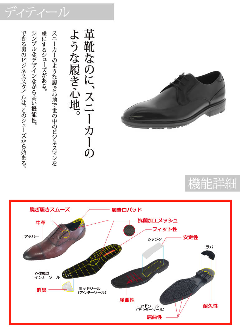 ・屈曲部を曲がりやすく設計で、スムーズな歩行をサポート・取外し式インナーソール・2E相当・ヒール高:約3.5cm・片足重量:約341g(参考サイズ:25.5cm)サイズ・素材・カラー全7サイズ(24.5cm/25.0cm/25.5cm/26.0cm/26.5cm/27.0cm/28.0cm)アッパー:天然皮革(牛革スムース) ソール アウターソール:合成底ブラック付属品-この商品のお問い合わせ番号SCR-item-46294