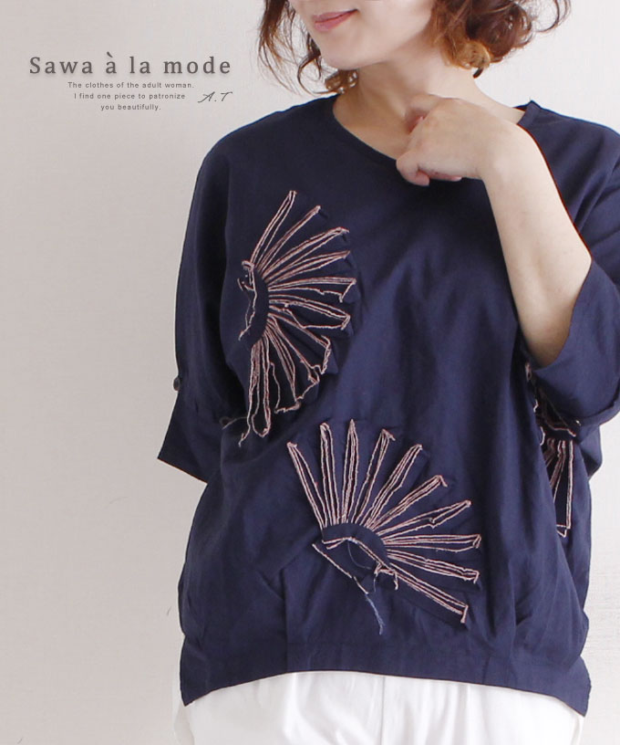 立体的な花刺繍のドルマンスリーブトップス レディース ファッション トップス ネイビー 6分袖 コットン リネン 春 夏 スリット ドルマンスリーブ 花模様 刺繍 飾りボタン Uネック 40代 50代 60代 サワアラモード otona kawaii