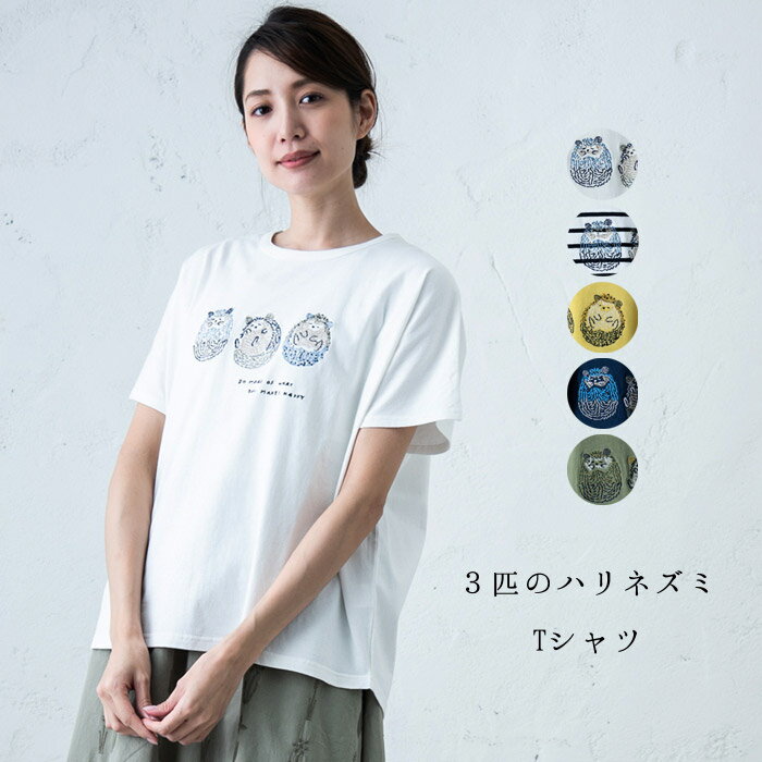 【3匹のはりねずみTシャツ】レディース/トップス/半袖/春夏/アニマル/かわいい/ハリネズミ/刺繍/ドルマン/ゆったり/大人の/イマゴ/ボーダー/アイボリー/マスタード/オリーブ/ネイビー/