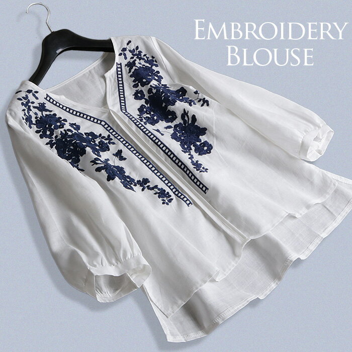 15%OFF!!クーポン付き トップス カットソー 総柄 刺繍 花 レース ブラウス レディース プルオーバー フェミニン 長袖 大きいサイズ【新作】リネンを配合したナチュラルな風合いに刺繍が映える七分袖ブラウス[NO.12-101-27](2038)