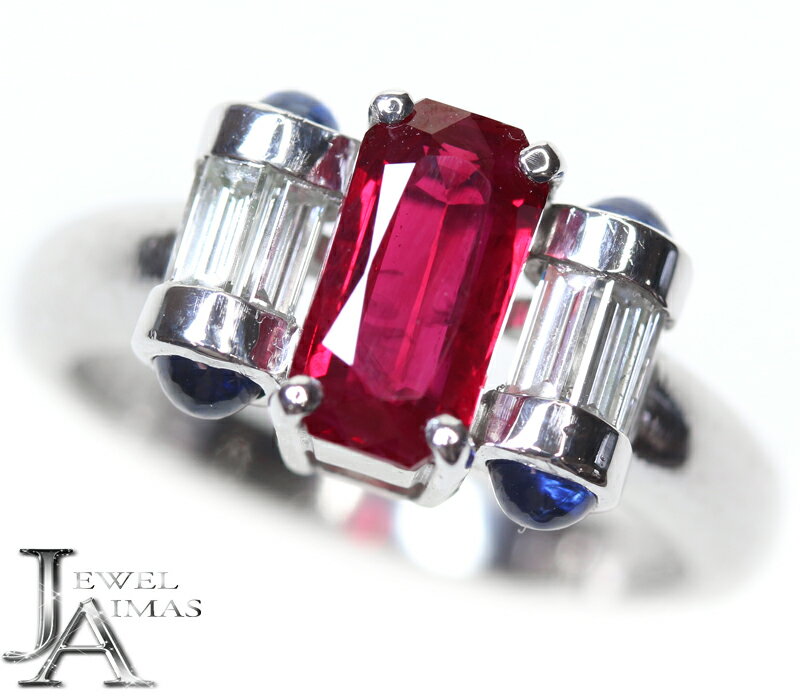ミャンマー産(ビルマ産)ルビー 1.49ct ブルーサファイアカボション 0.62ct ダイヤモンド 0.43ct リング 12号 PT900 プラチナ Myanmar/Burma ビビッドレッド<AIGS鑑別書>【中古】【ジュエリー】MEP