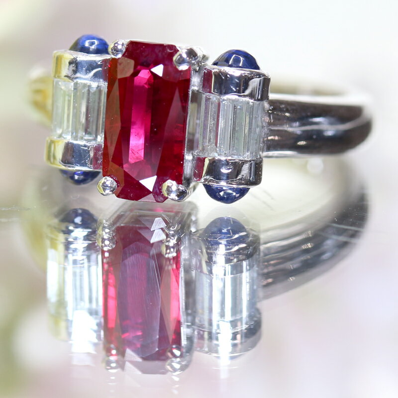 管理番号 043900/3ZGW/MEP 素材 【地金】 PT900 【石】 ルビー:1.49ct ブルーサファイア:0.62ct ダイヤモンド:0.43ct サイズ 12号 サイズ直し可(詳細はこちら) 最大幅:8.8mm 最小幅:2.6mm 重量:7.8g 付属品 AIGS鑑別書 宝石評価 【☆